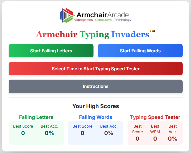 Armchair Typing Invaders includes FALLING LETTERS, FALLING WORDS, and TYPING SPEED TESTER.